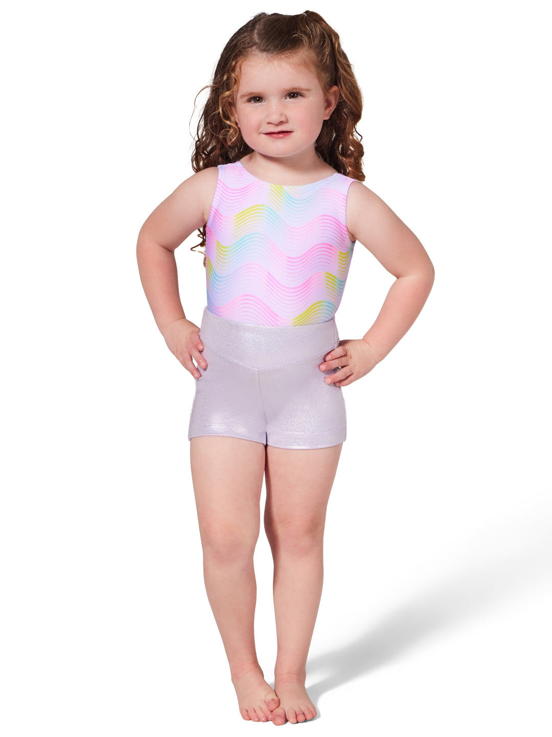 Ride the wave in style with the Swell Short from the Sunset Wave collection. Made from a flexible blend of Nylon and Lycra, this short offers the perfect combination of comfort and shimmer with its foil fabric accents. Featuring a flattering low V-shaped front waistband and a straight back waistband, it provides both style and support. Pairs perfectly with any leotard from the Sunset Wave collection.
